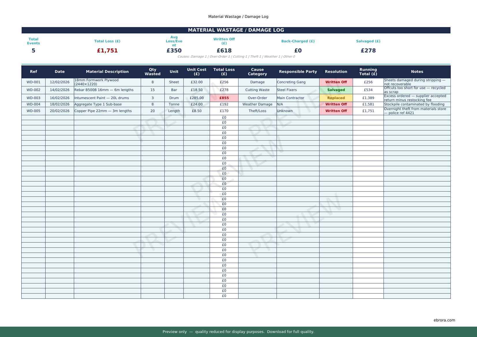 Free Excel template: Material Wastage Damage Log. Download for UK construction sites.