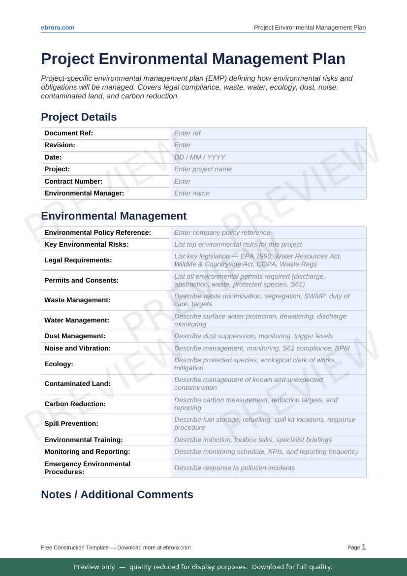 Free Word template: Project Environmental Management Plan. Download for UK construction sites.