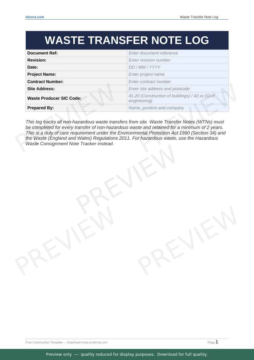 Free Word template: Waste Transfer Note Log. Download for UK construction sites.