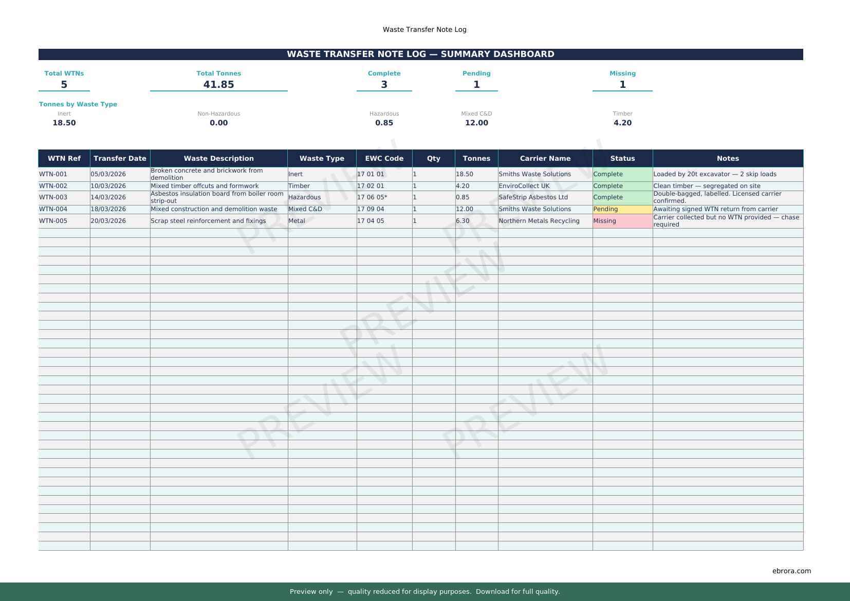 Free Excel template: Waste Transfer Note Register. Download for UK construction sites.
