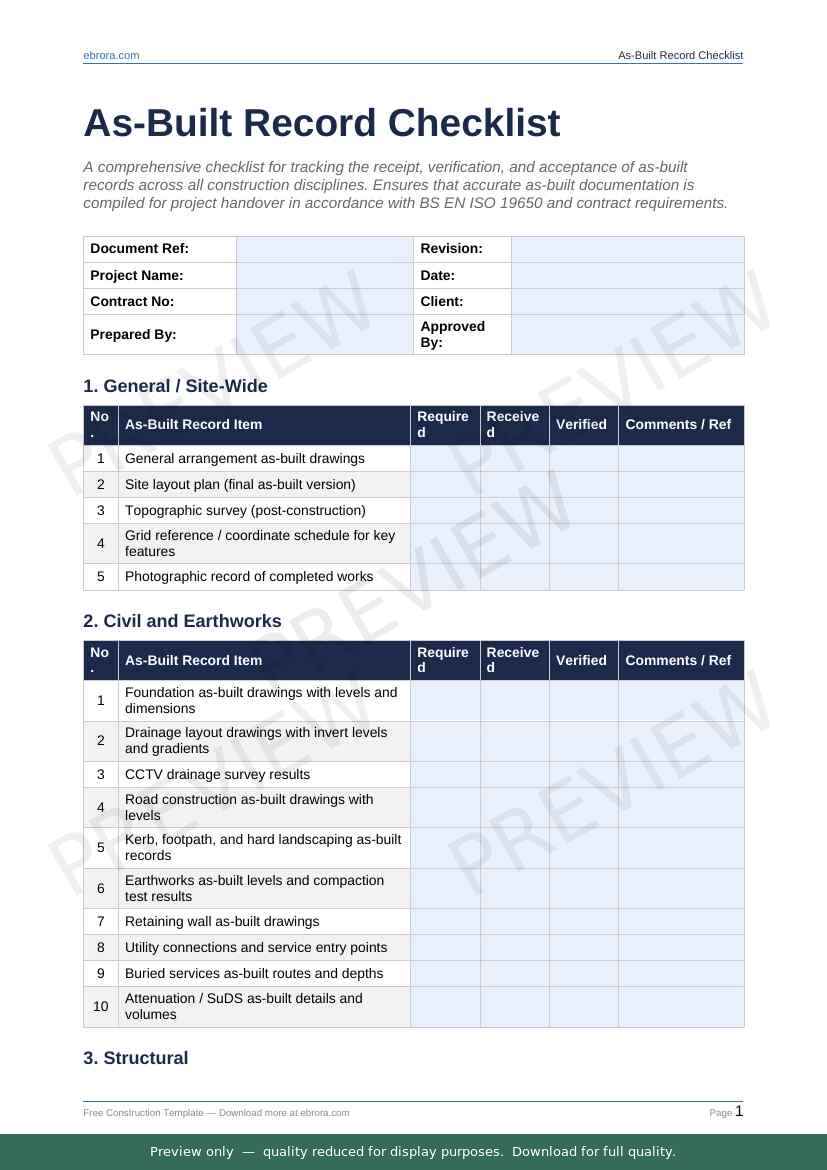 Free Word template: As Built Record Checklist. Download for UK construction sites.