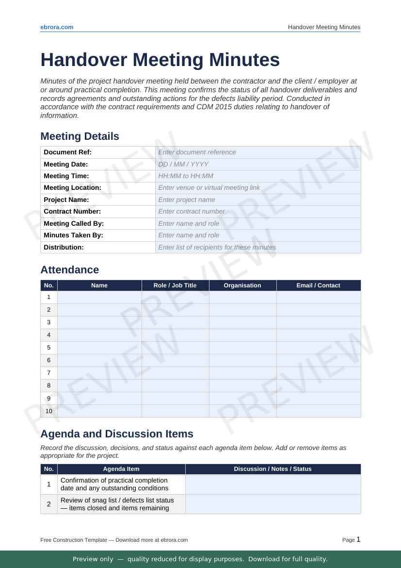 Free Word template: Handover Meeting Minutes Template. Download for UK construction sites.
