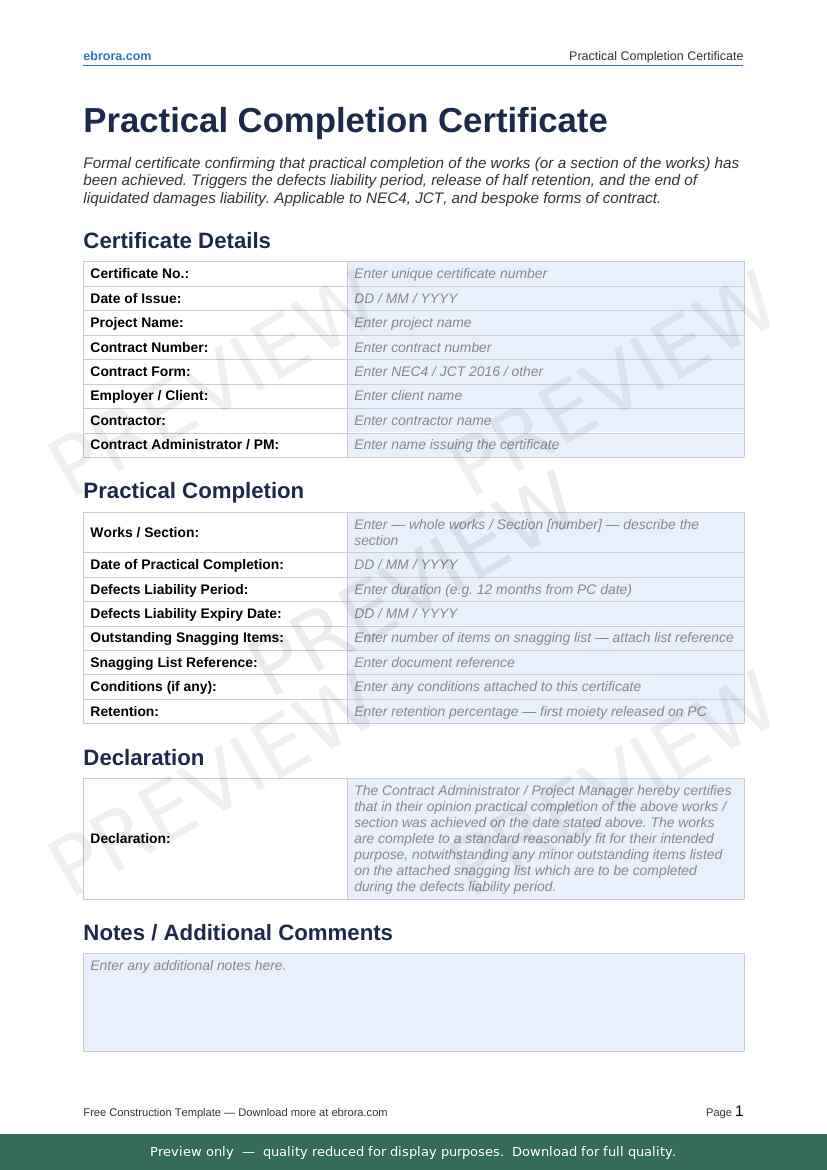 Free Word template: Practical Completion Certificate. Download for UK construction sites.