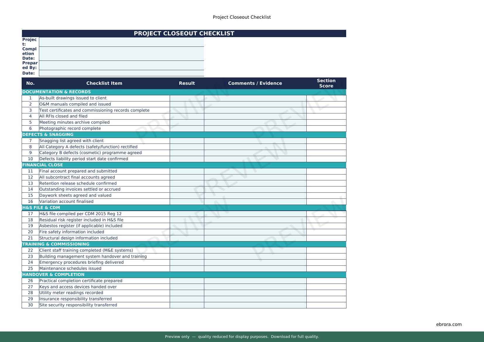 Free Excel template: Project Closeout Checklist. Download for UK construction sites.