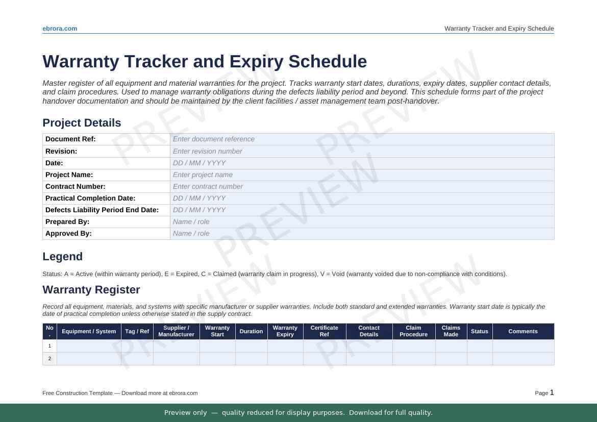 Free Word template: Warranty Tracker and Expiry Schedule. Download for UK construction sites.