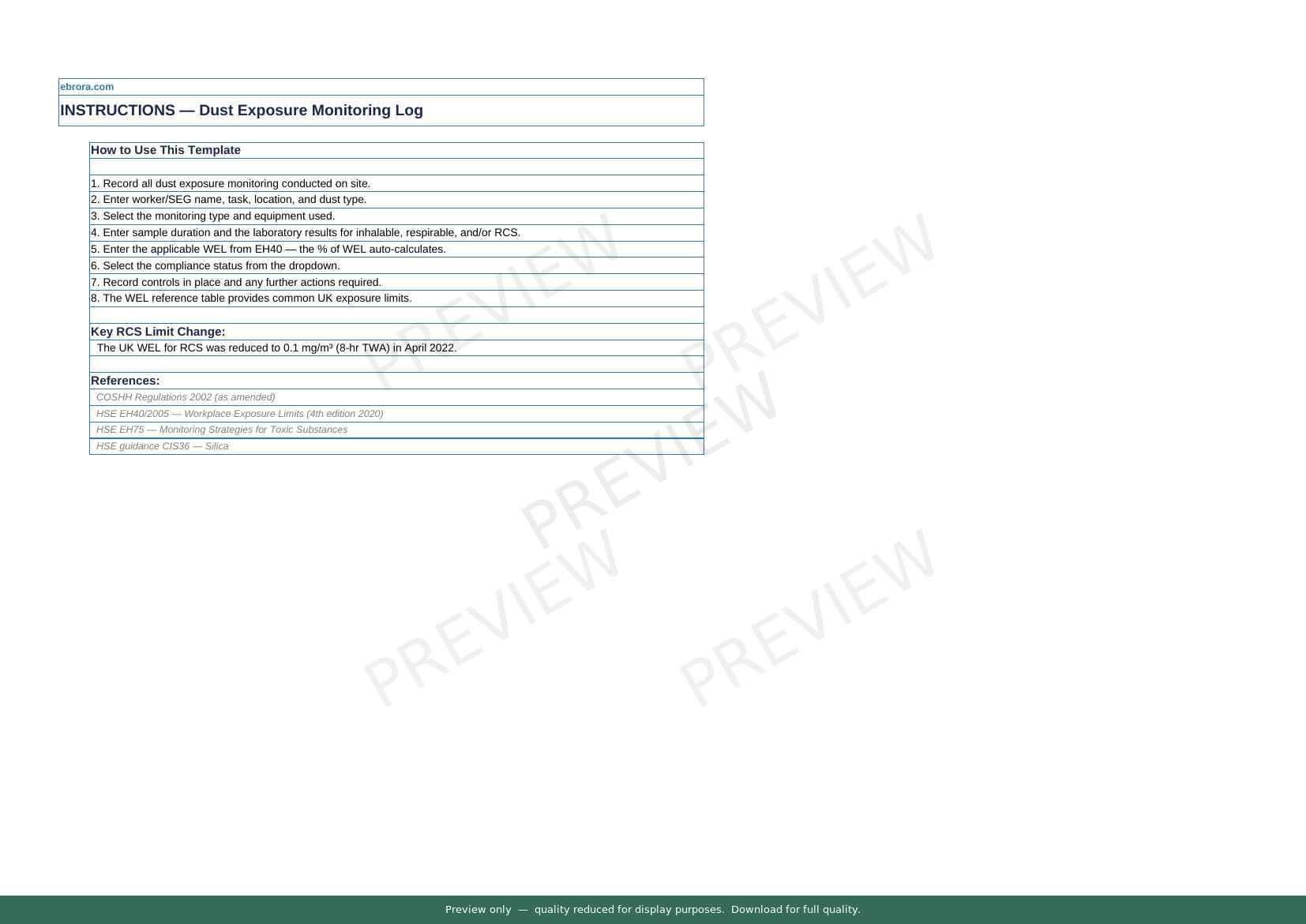 Free Excel template: Dust Exposure Monitoring Log. Download for UK construction sites.