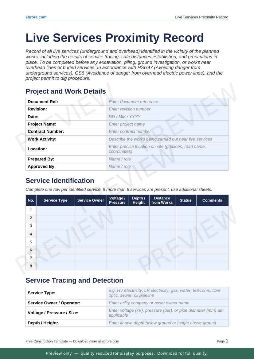 Free Word template: Live Services Proximity Record. Download for UK construction sites.