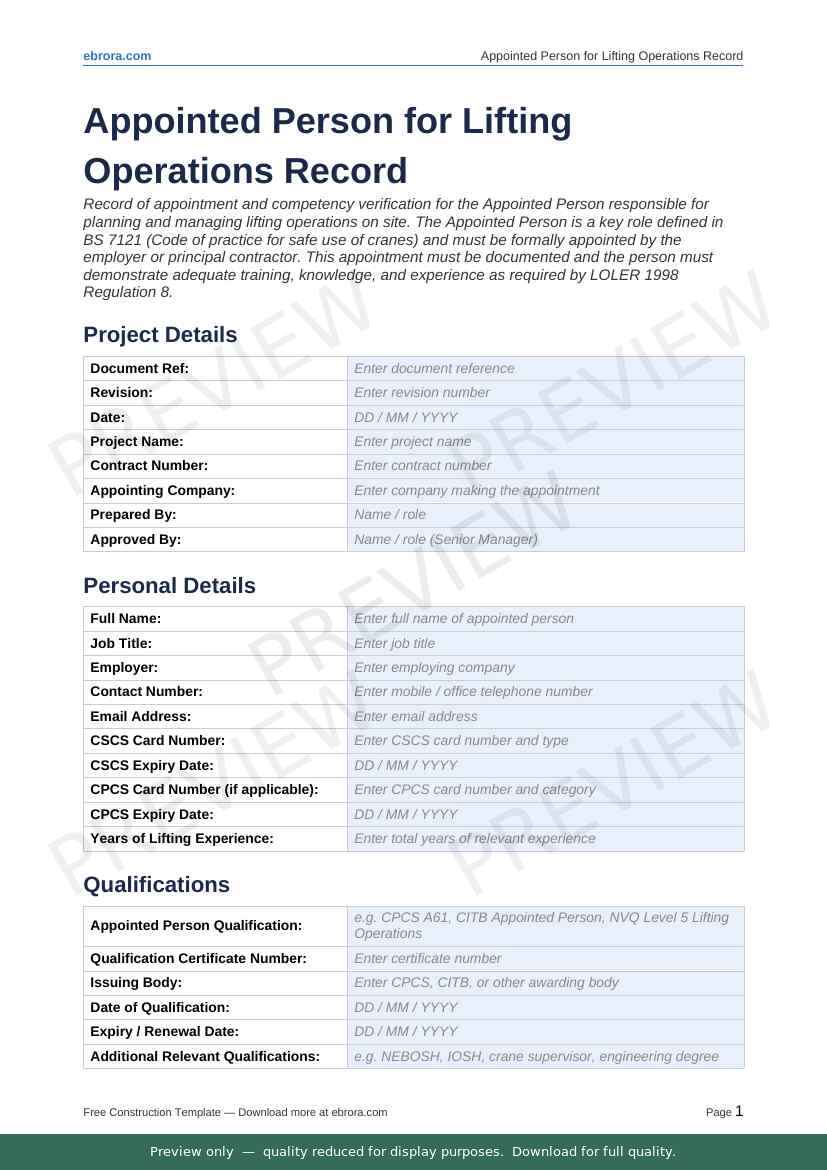 Free Word template: Appointed Person for Lifting Operations Record. Download for UK construction sites.