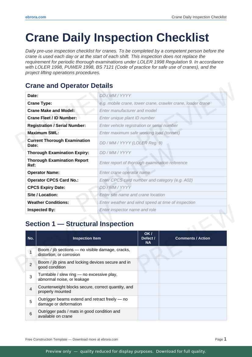 Free Word template: Crane Daily Inspection Checklist. Download for UK construction sites.