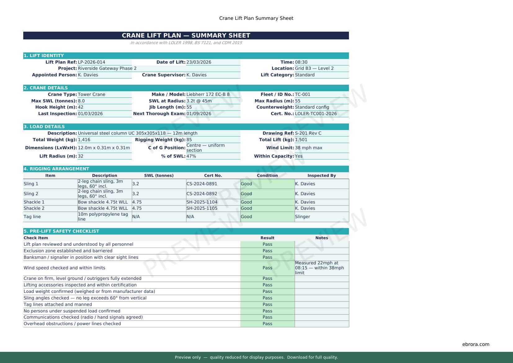 Free Excel template: Crane Lift Plan Summary. Download for UK construction sites.
