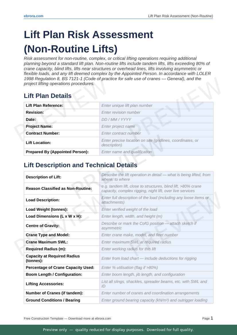 Free Word template: Lift Plan Risk Assessment Non Routine Lifts. Download for UK construction sites.