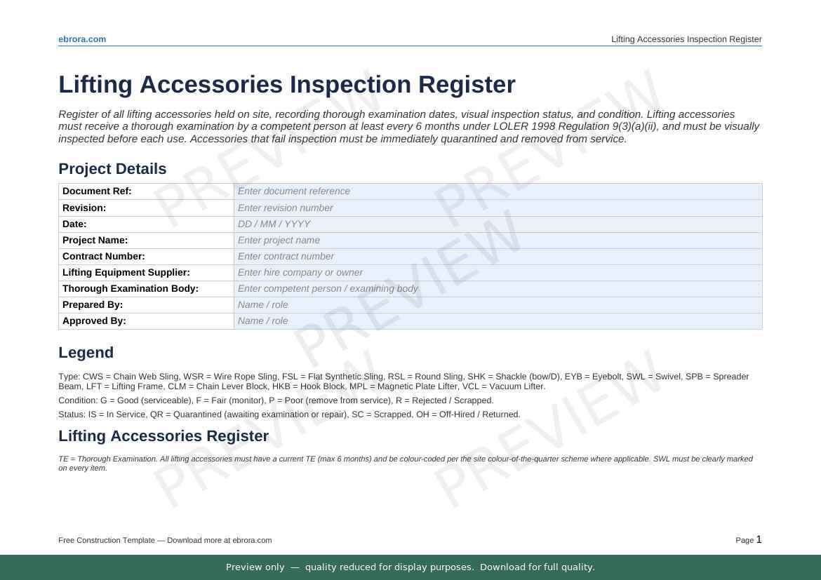 Free Word template: Lifting Accessories Inspection Register. Download for UK construction sites.