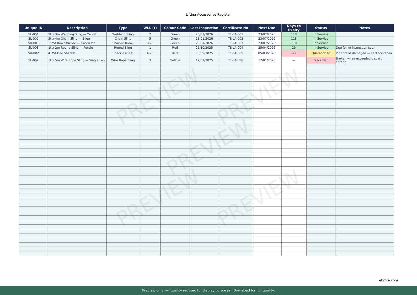 Free Excel template: Lifting Accessories Register. Download for UK construction sites.