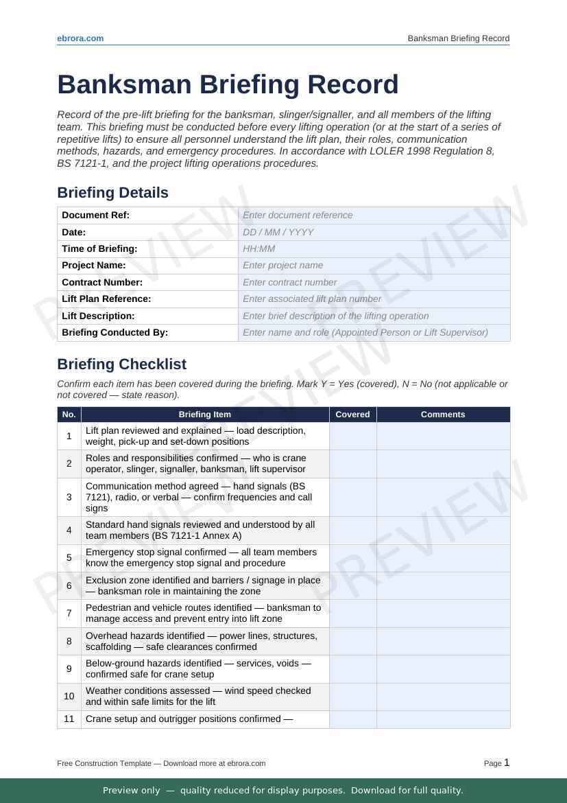 Free Word template: Banksman Briefing Record. Download for UK construction sites.