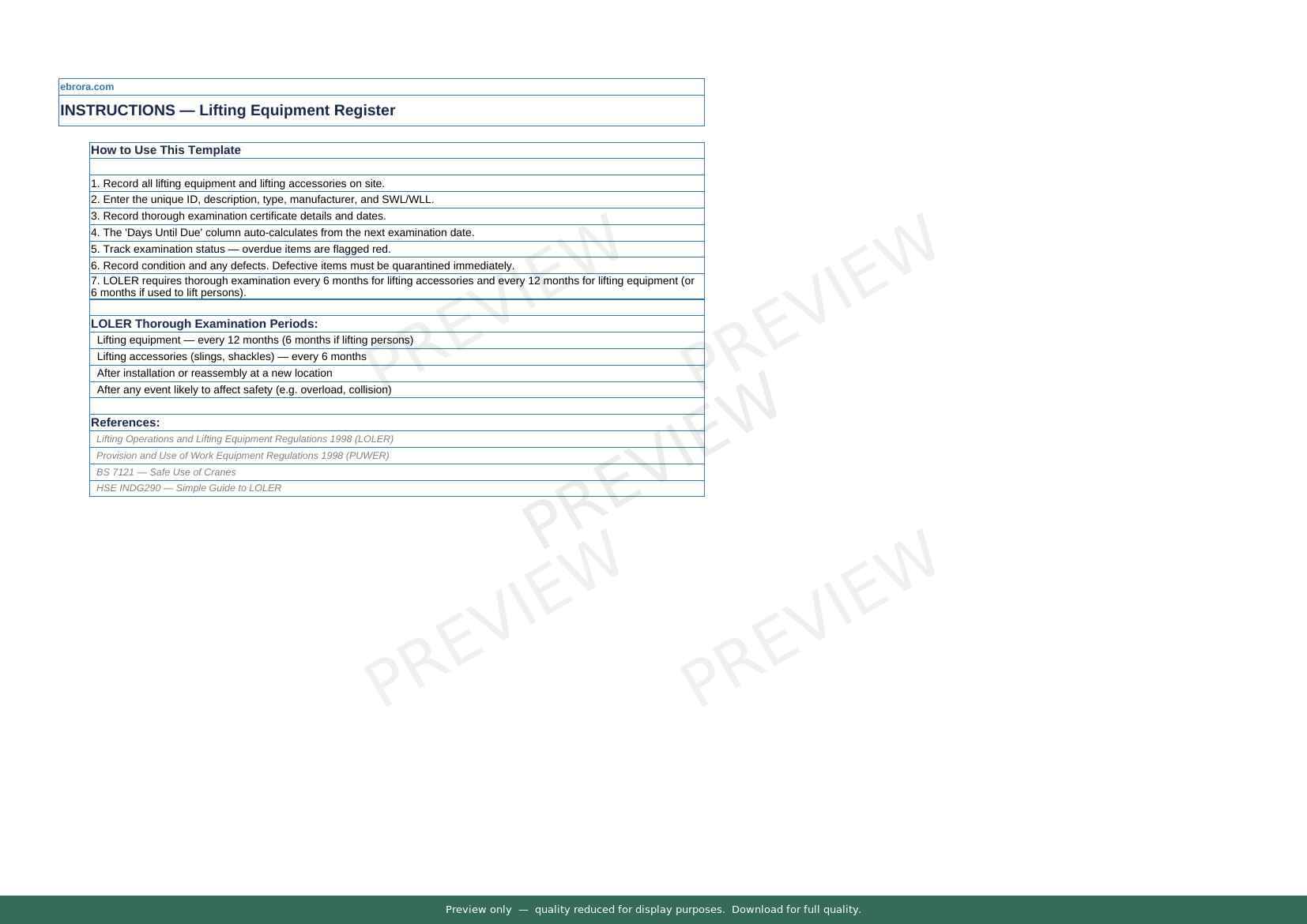 Free Excel template: Lifting Equipment Register. Download for UK construction sites.
