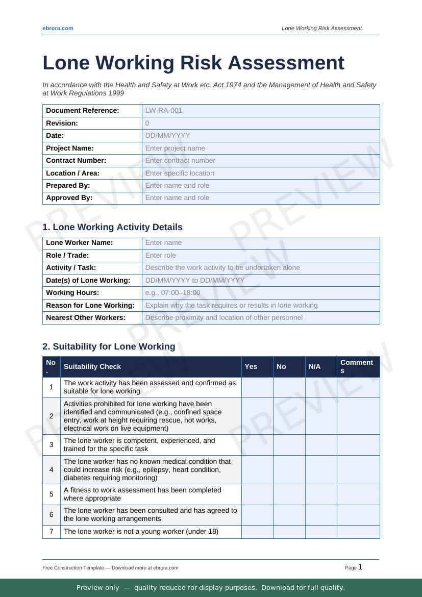 Free Word template: Lone Working Risk Assessment. Download for UK construction sites.