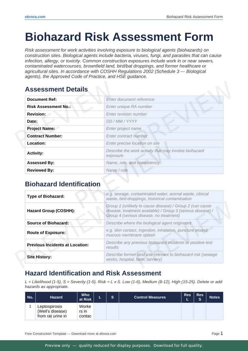 Free Word template: Biohazard Risk Assessment Form. Download for UK construction sites.