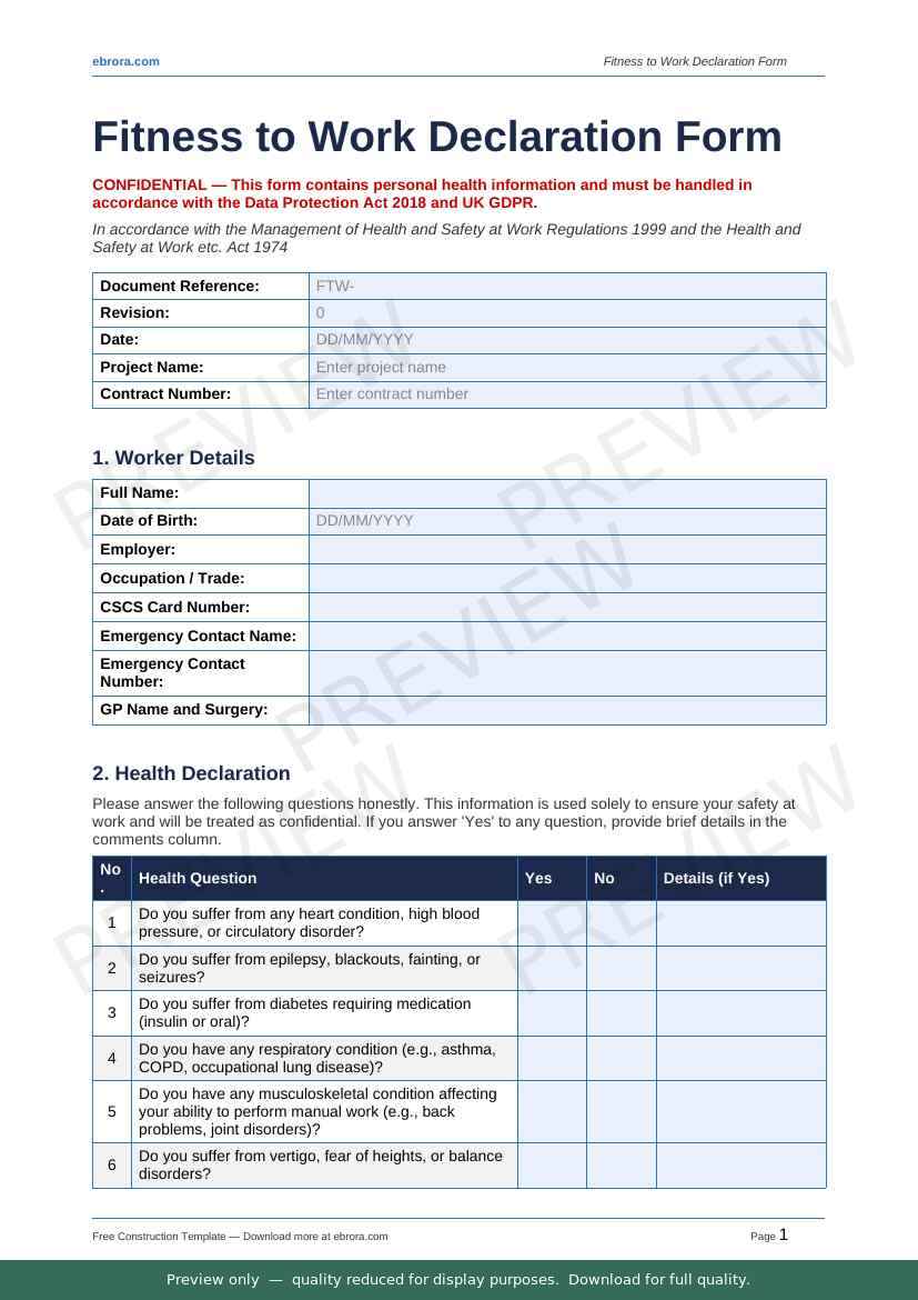 Free Word template: Fitness to Work Declaration Form. Download for UK construction sites.