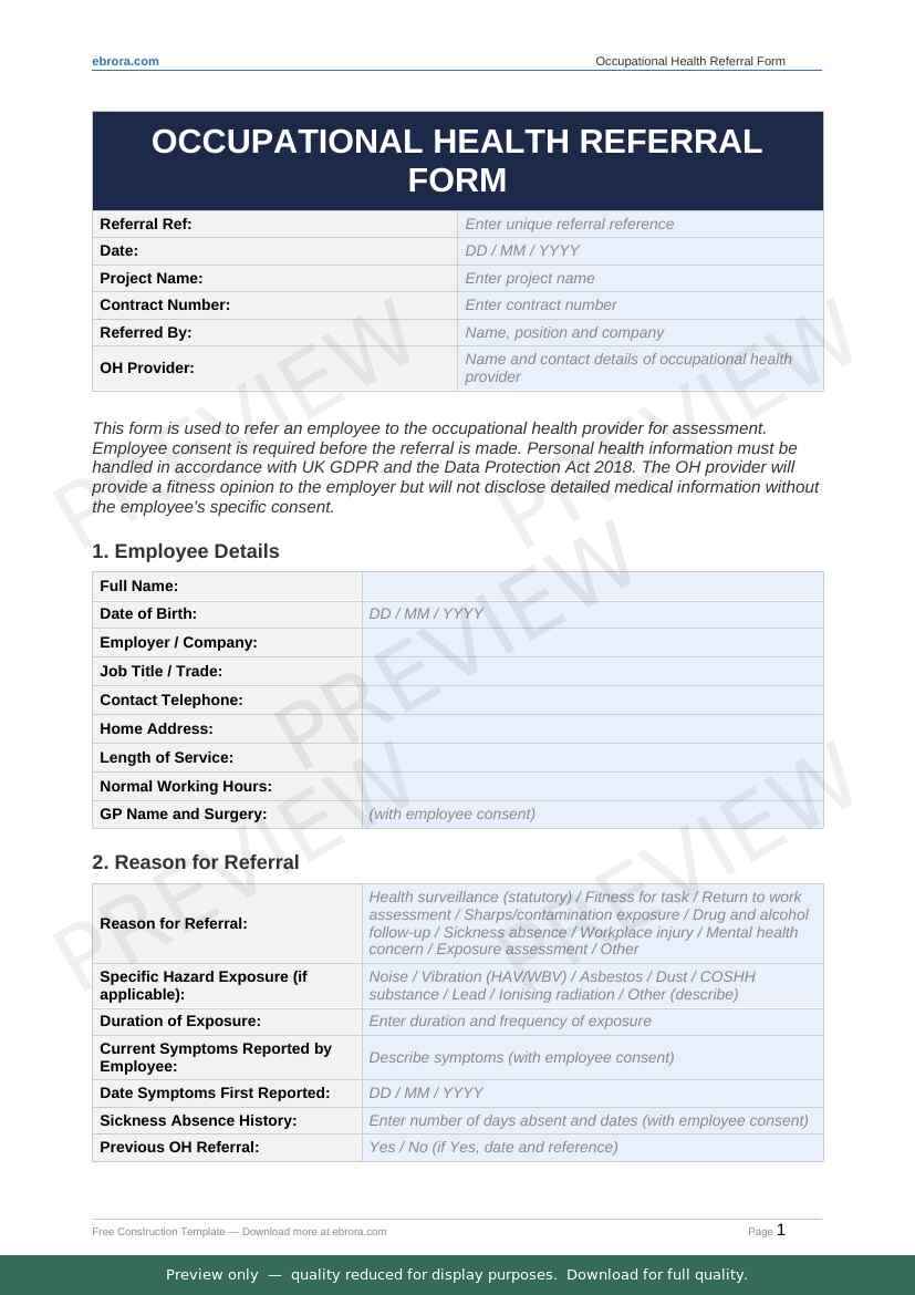 Free Word template: Occupational Health Referral Form. Download for UK construction sites.