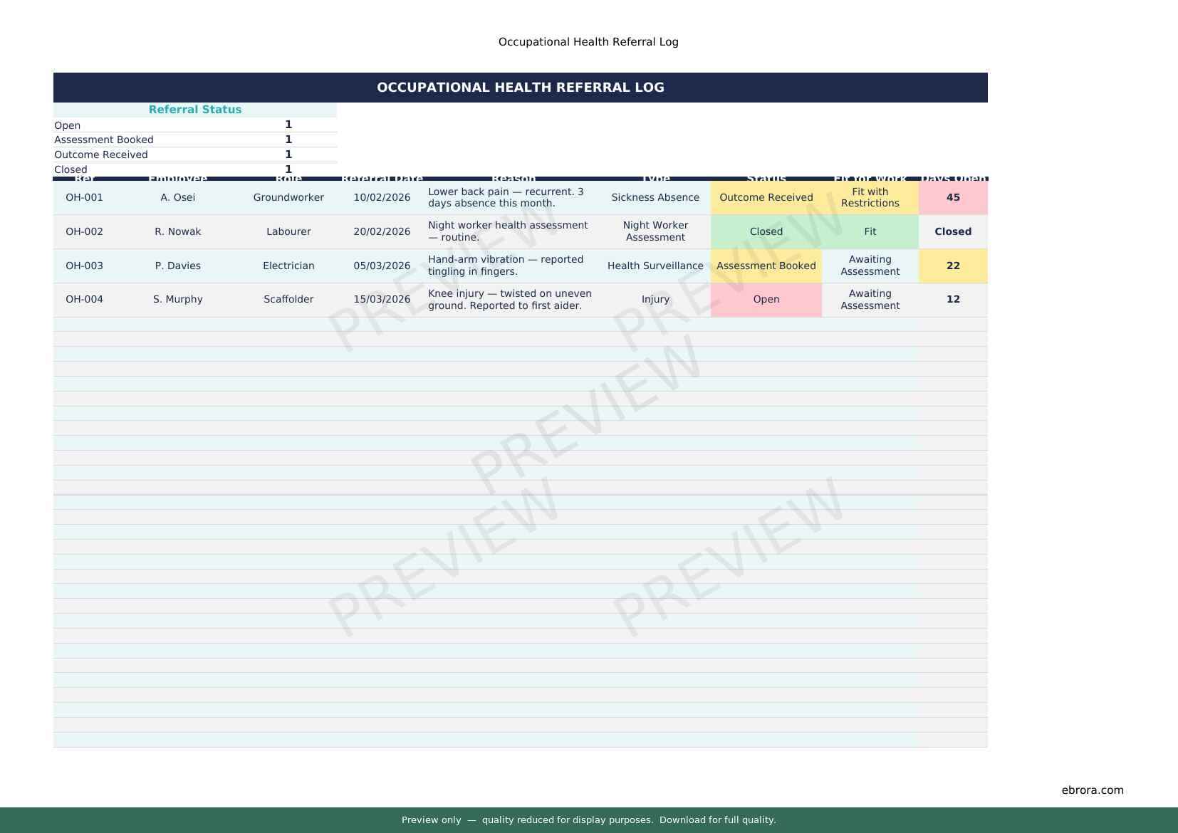 Free Excel template: Occupational Health Referral Log. Download for UK construction sites.