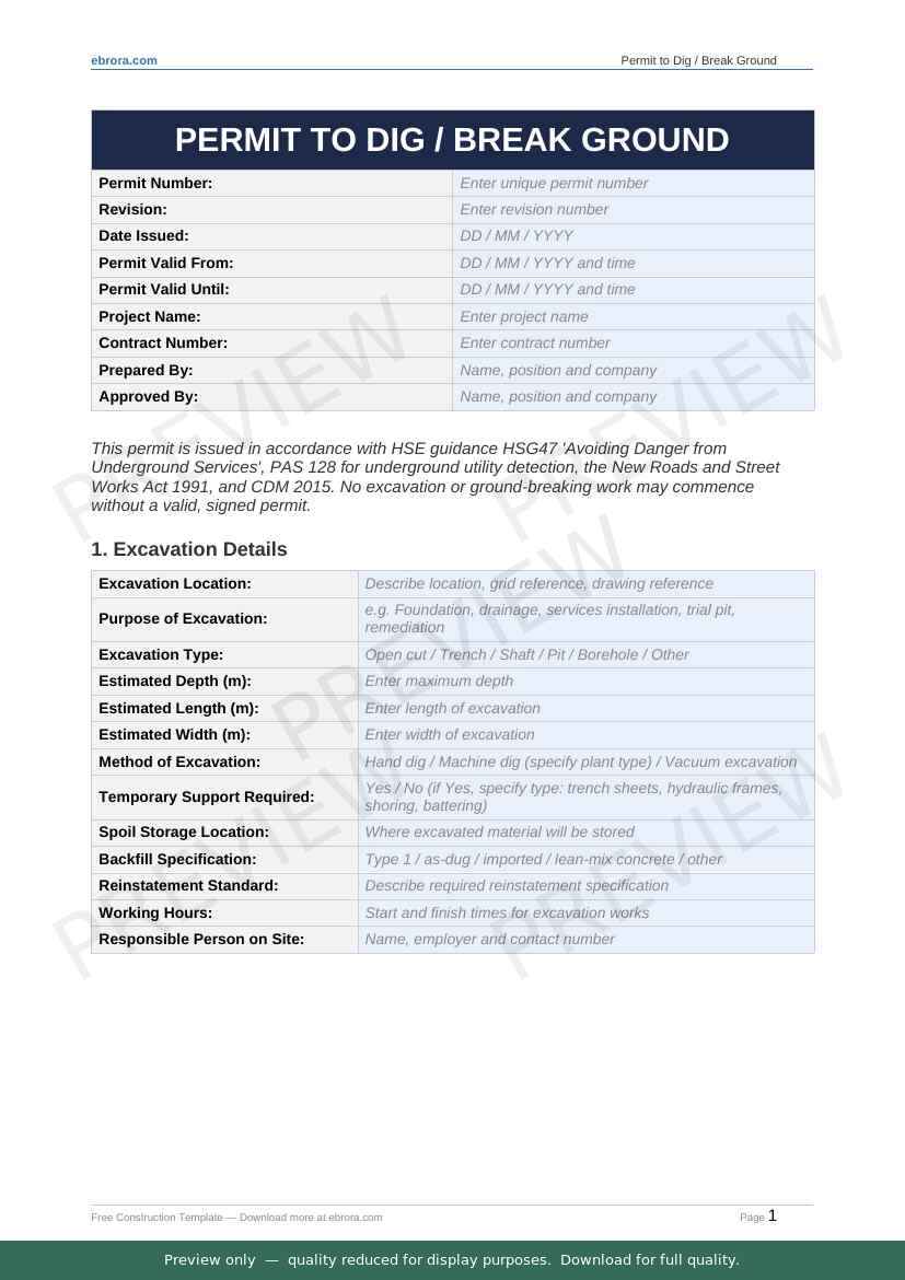 Free Word template: Permit to Dig. Download for UK construction sites.