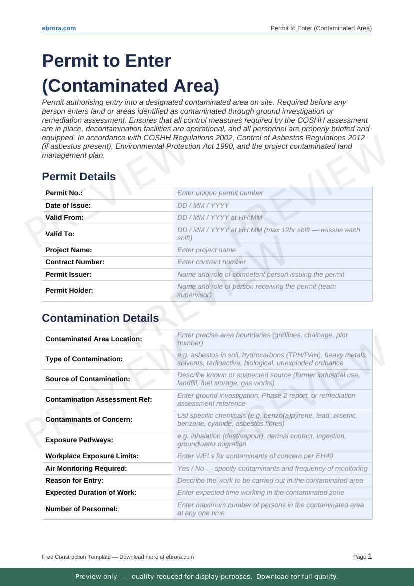 Free Word template: Permit to Enter Contaminated Area. Download for UK construction sites.
