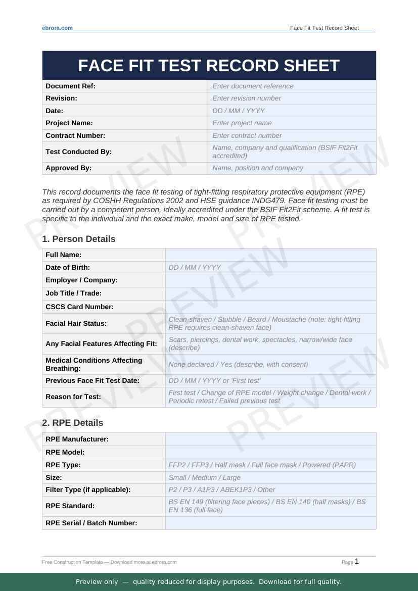Free Word template: Face Fit Test Record Sheet. Download for UK construction sites.