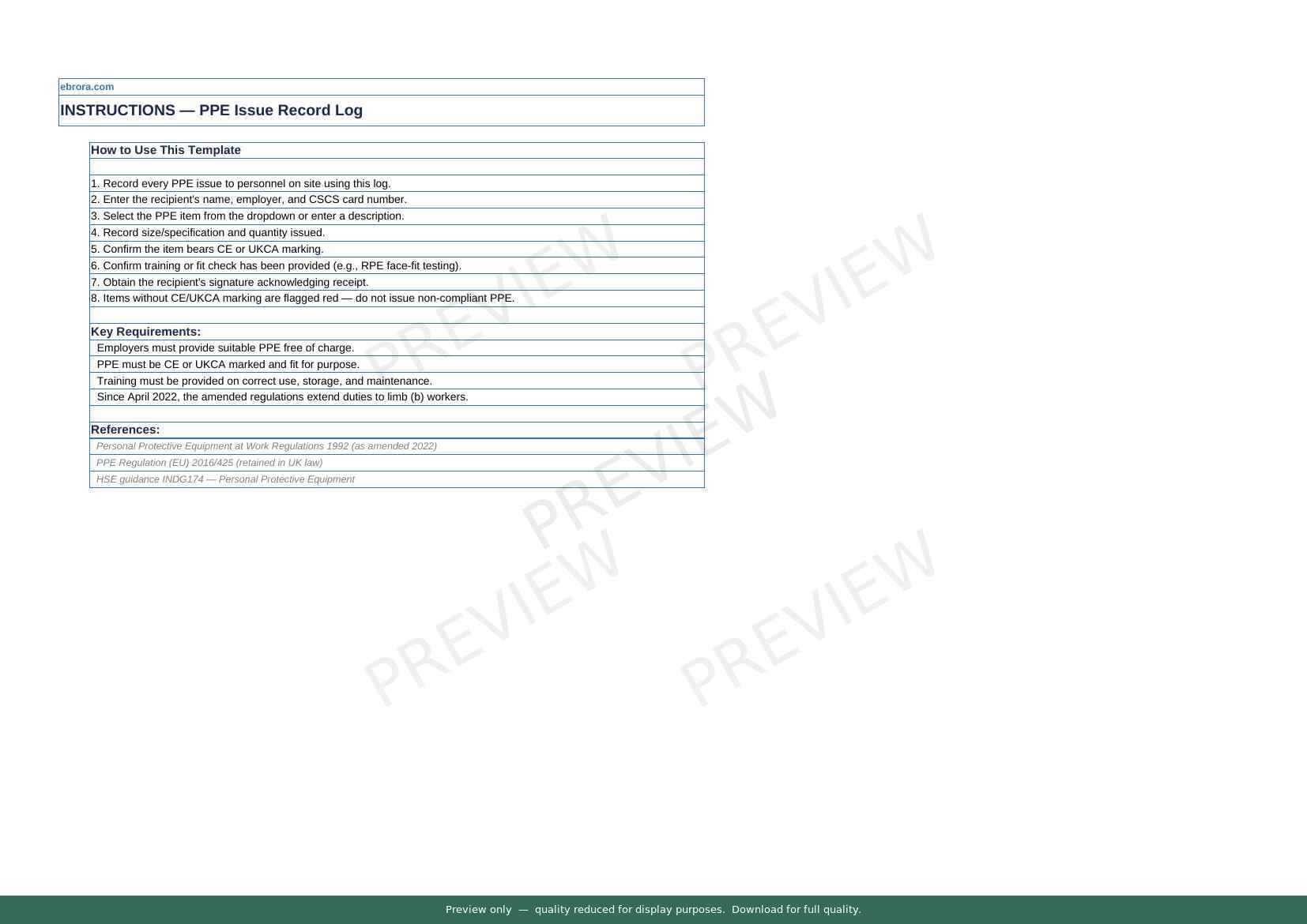 Free Excel template: Ppe Issue Record Log. Download for UK construction sites.