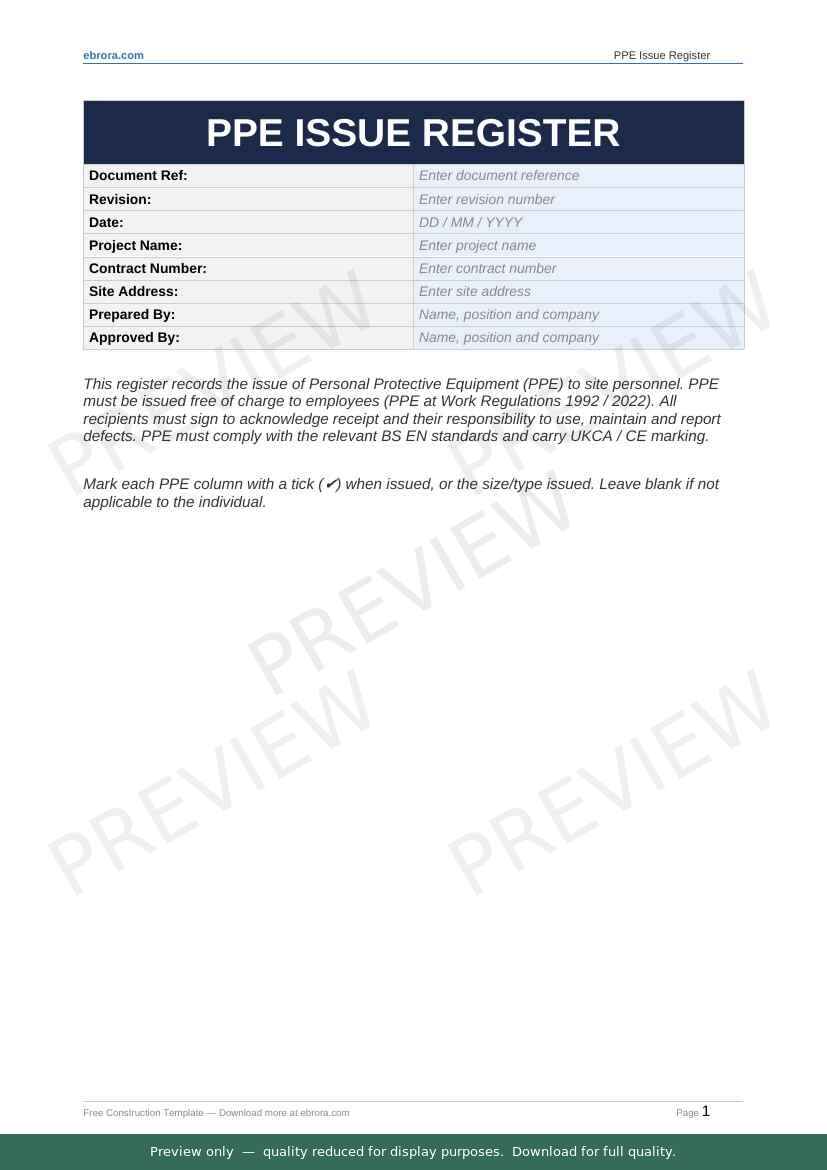 Free Word template: Ppe Issue Register. Download for UK construction sites.