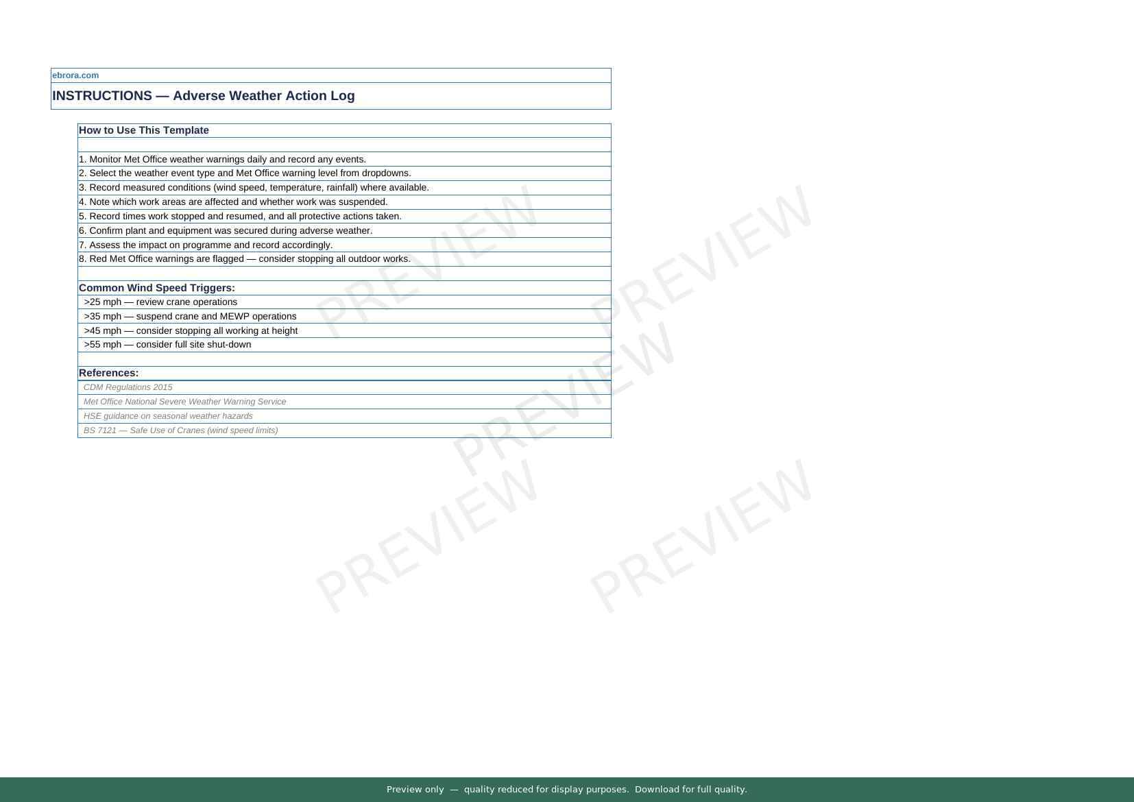 Free Excel template: Adverse Weather Action Log. Download for UK construction sites.