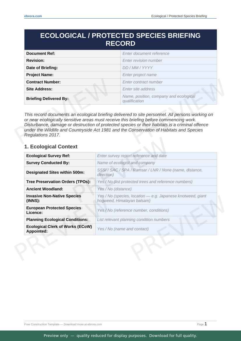 Free Word template: Ecological Protected Species Briefing Record. Download for UK construction sites.