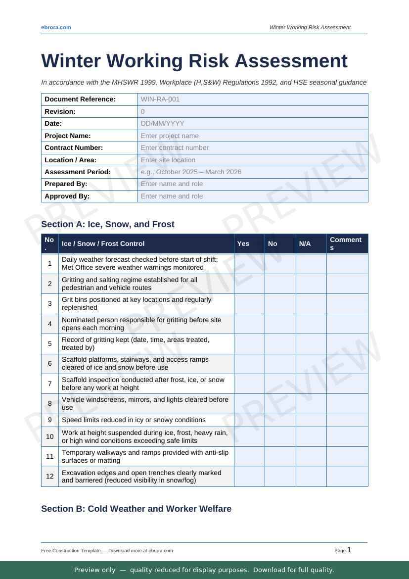Free Word template: Winter Working Risk Assessment. Download for UK construction sites.