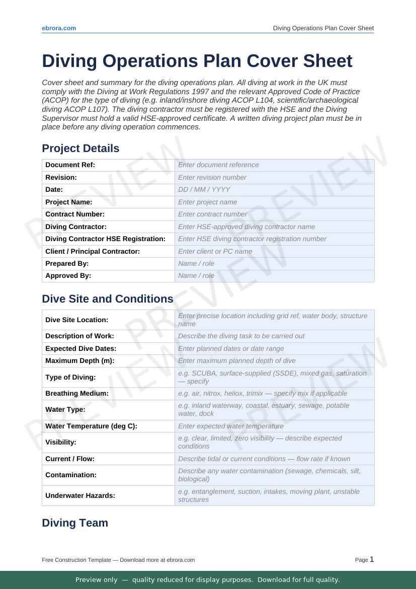 Free Word template: Diving Operations Plan Cover Sheet. Download for UK construction sites.