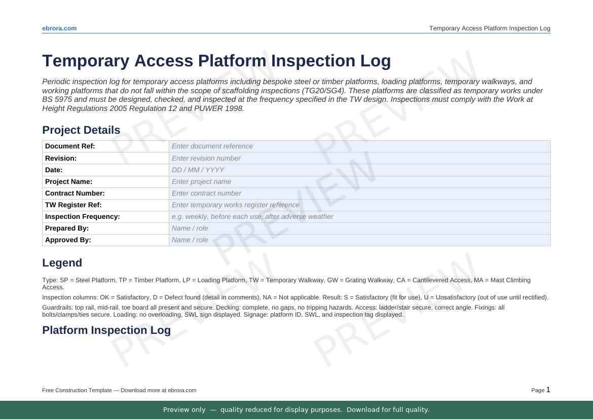 Free Word template: Temporary Access Platform Inspection Log. Download for UK construction sites.