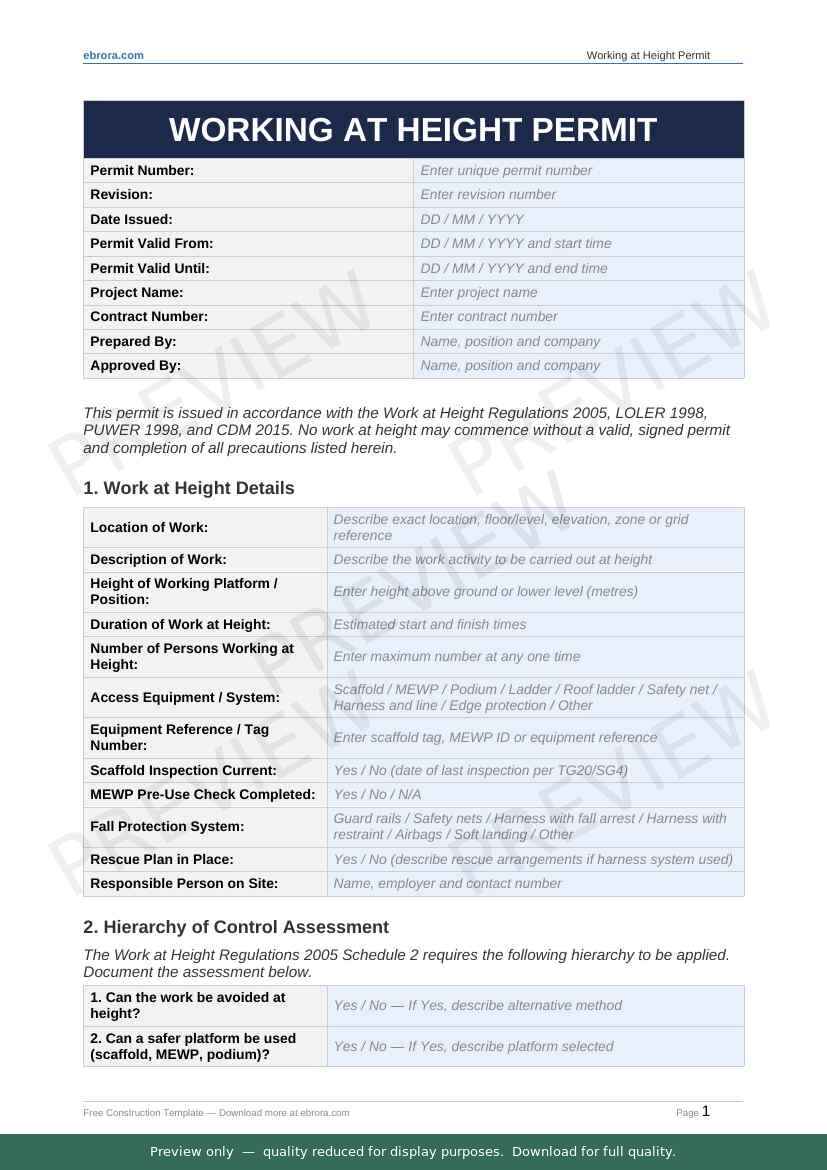 Free Word template: Working At Height Permit. Download for UK construction sites.