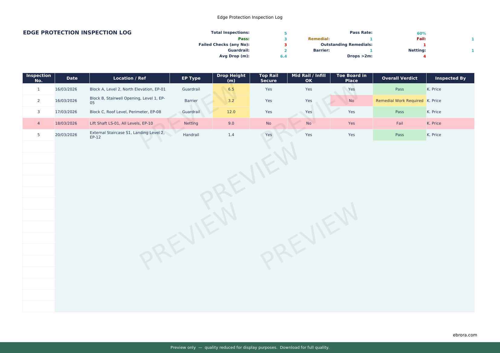 Free Excel template: Edge Protection Inspection Log. Download for UK construction sites.