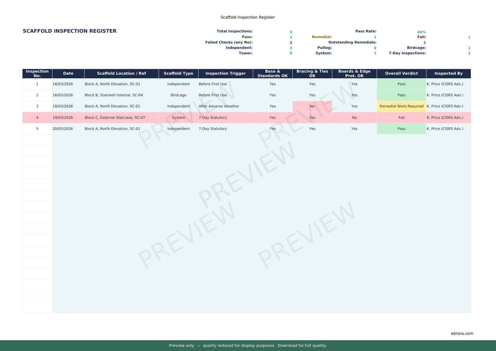 Free Excel template: Scaffold Inspection Register. Download for UK construction sites.