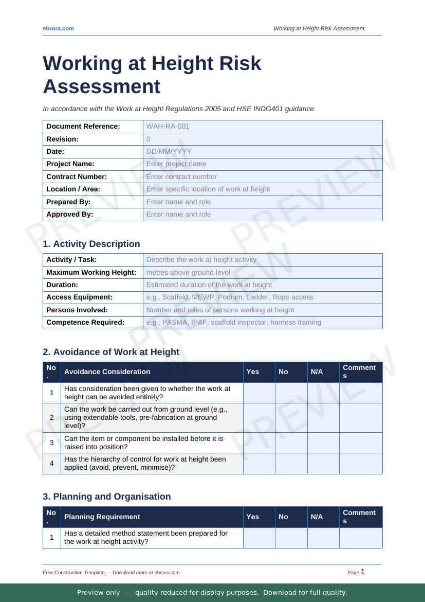 Free Word template: Working At Height Risk Assessment. Download for UK construction sites.