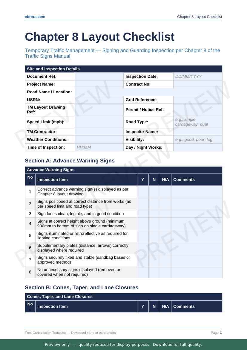 Free Word template: Chapter 8 Layout Checklist. Download for UK construction sites.