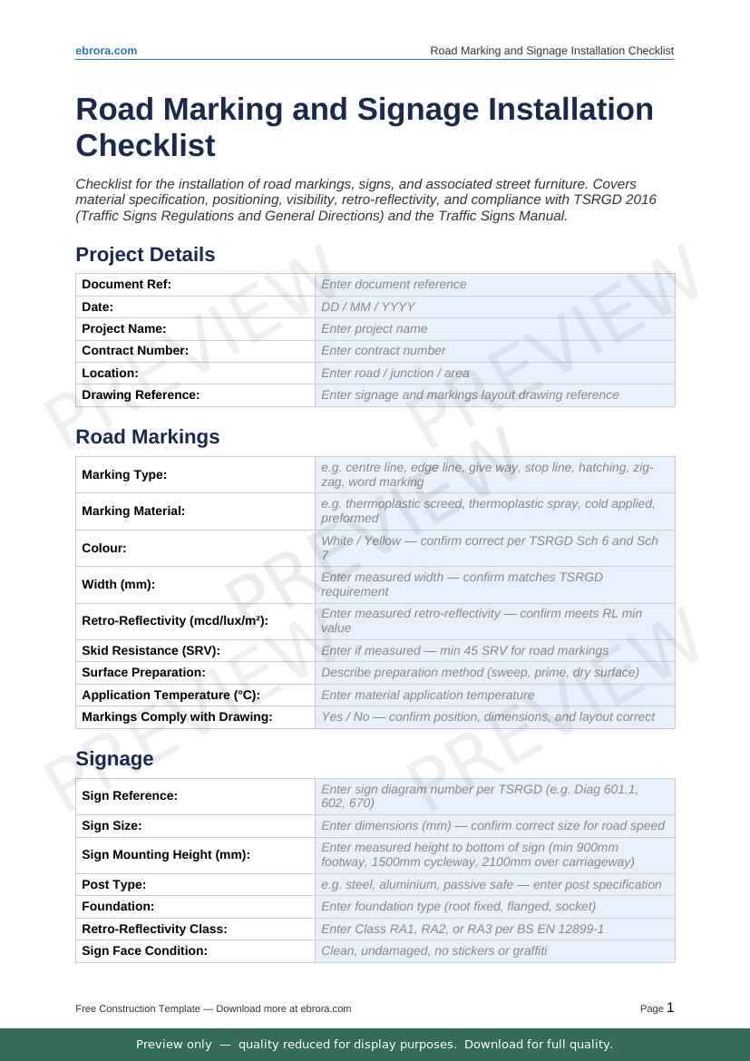 Free Word template: Road Marking and Signage Installation Checklist. Download for UK construction sites.