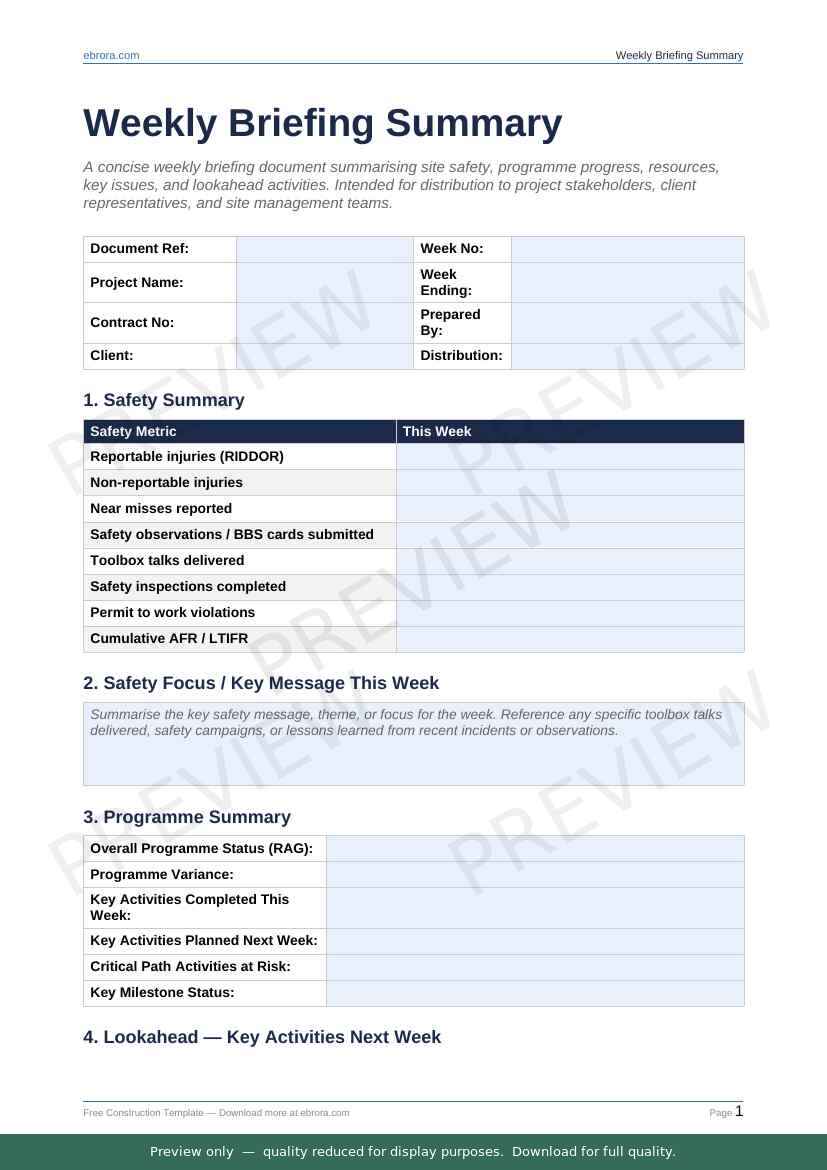 Free Word template: Weekly Briefing Summary. Download for UK construction sites.
