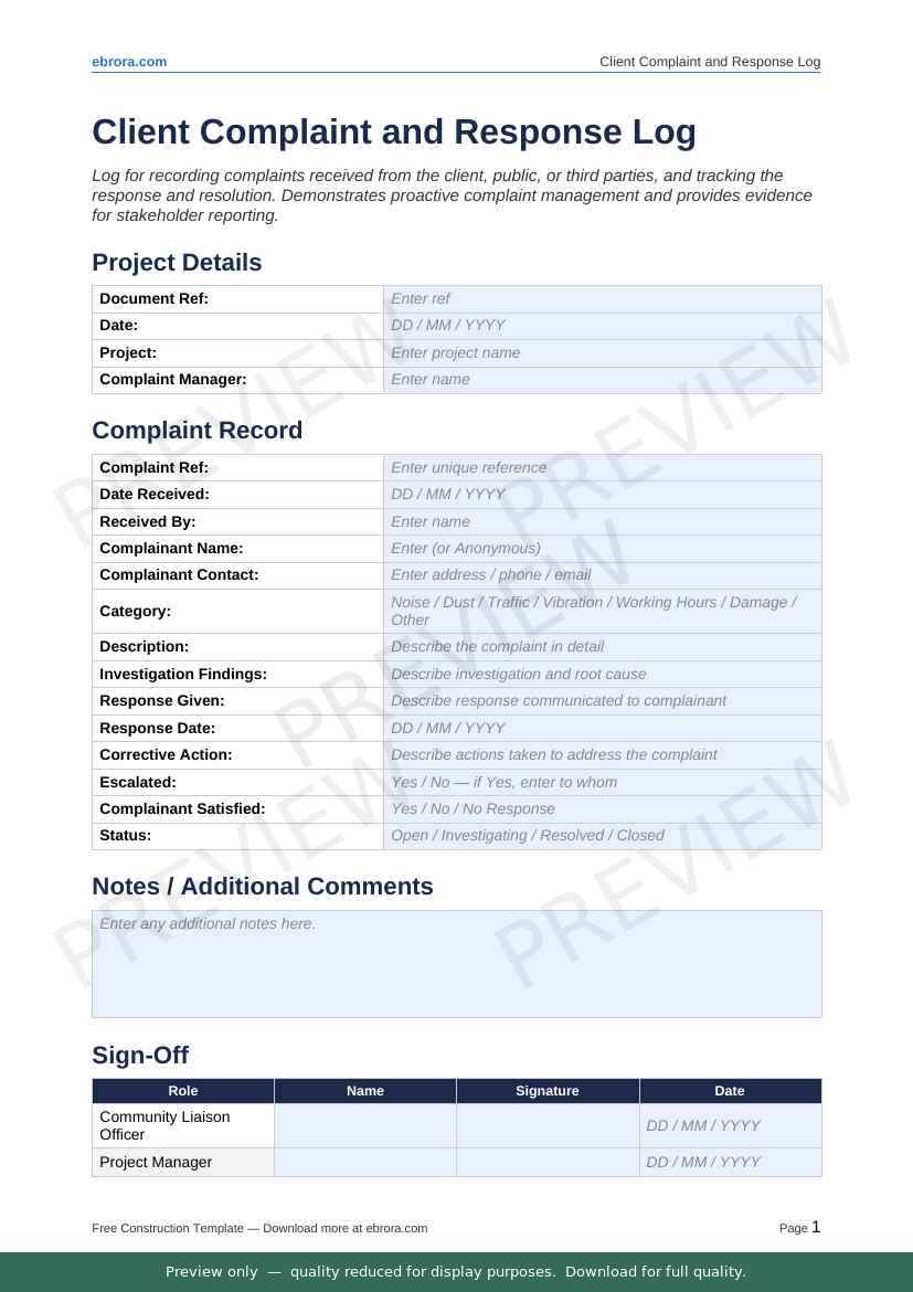 Free Word template: Client Complaint and Response Log. Download for UK construction sites.