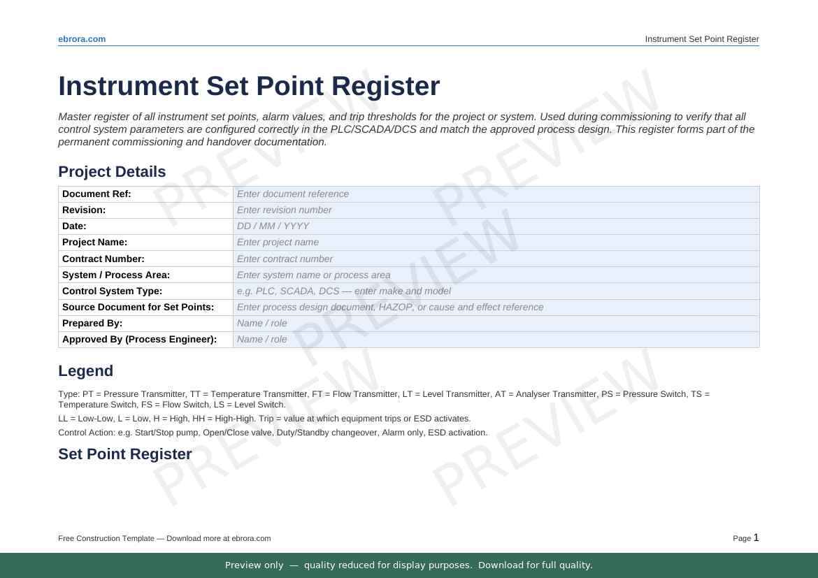 Free Word template: Instrument Set Point Register. Download for UK construction sites.