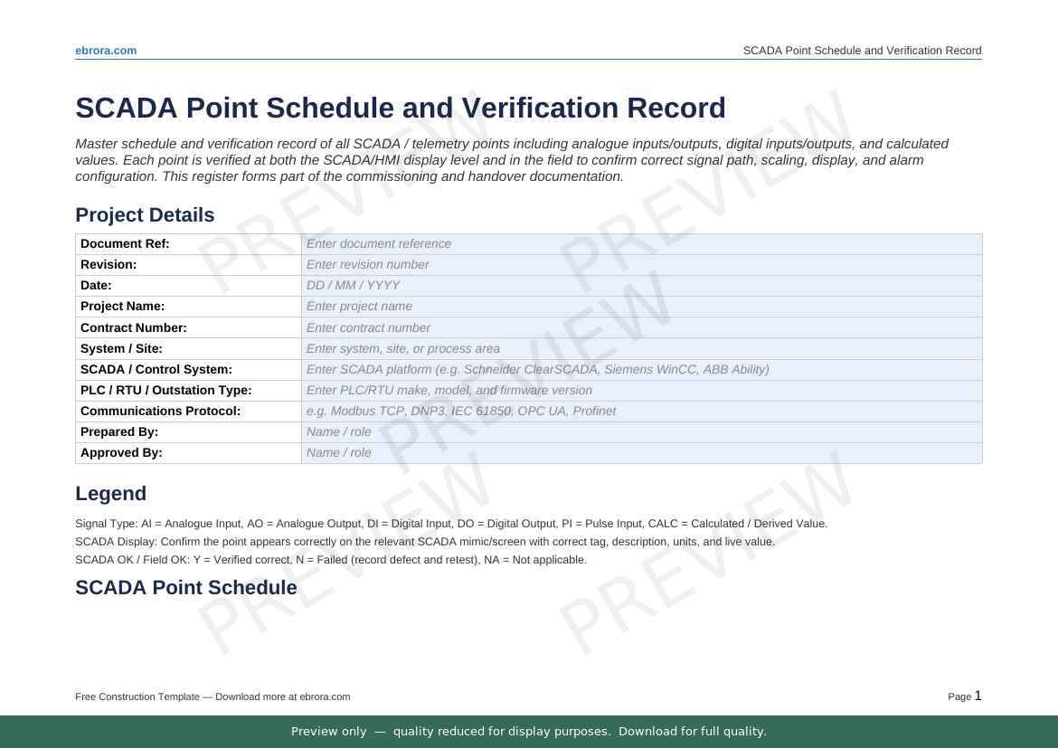 Free Word template: Scada Point Schedule and Verification Record. Download for UK construction sites.
