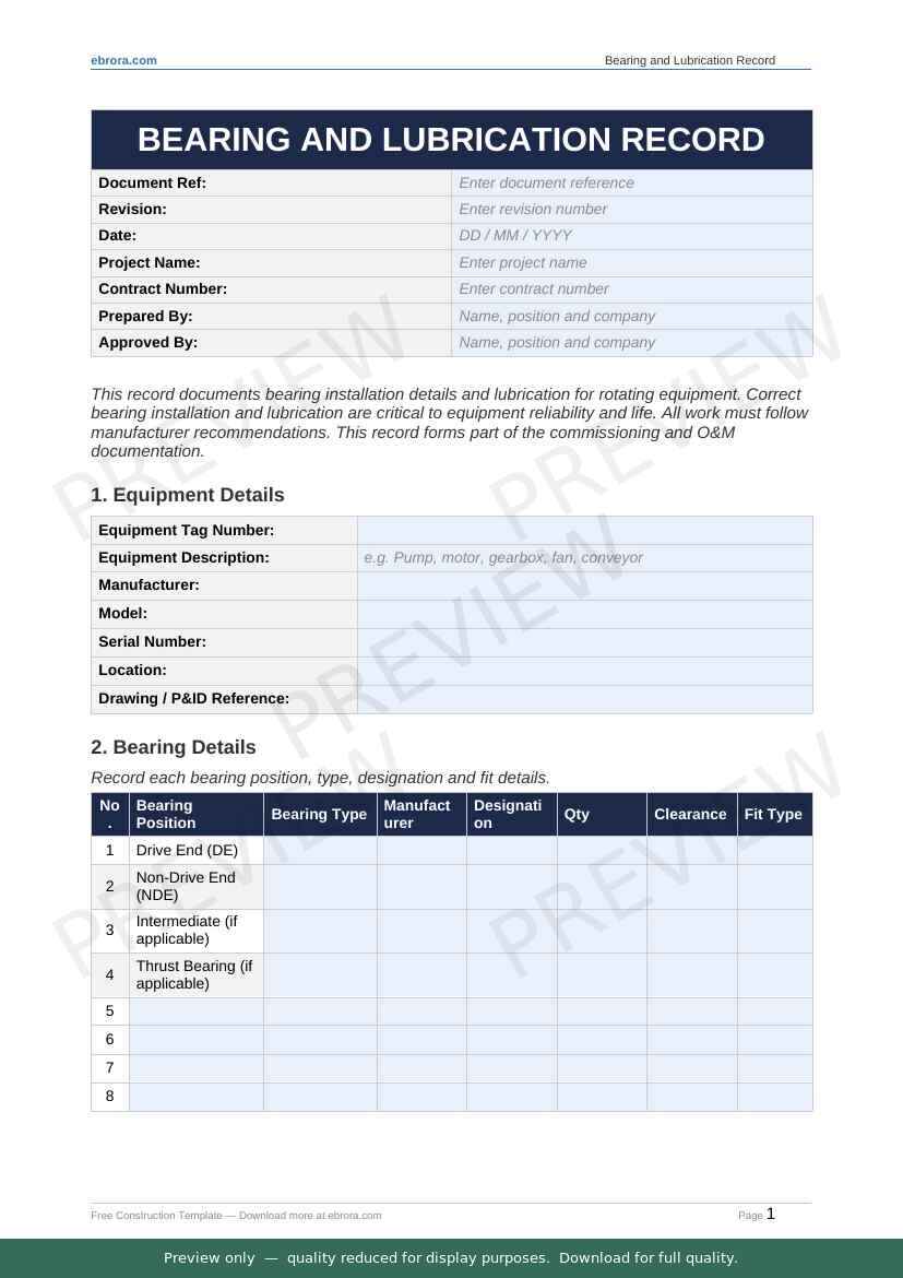 Free Word template: Bearing and Lubrication Record. Download for UK construction sites.