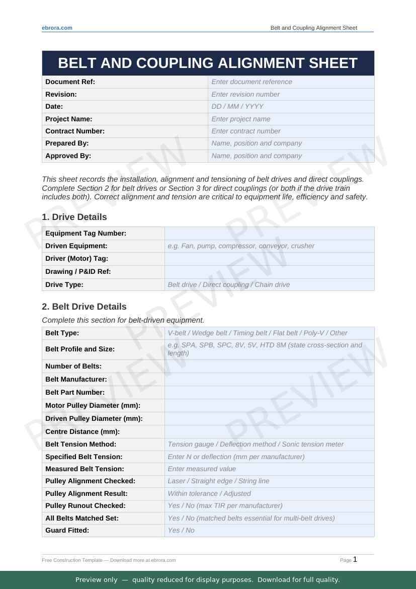 Free Word template: Belt and Coupling Alignment Sheet. Download for UK construction sites.