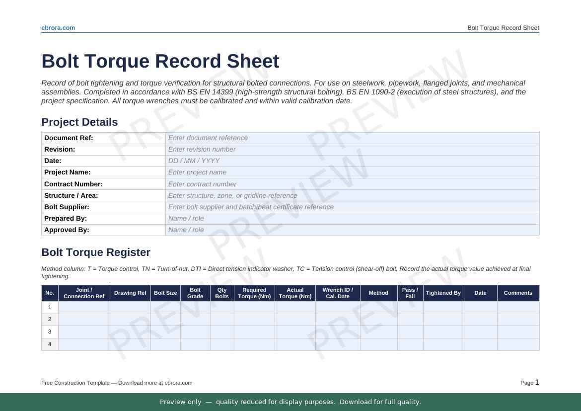 Free Word template: Bolt Torque Record Sheet. Download for UK construction sites.