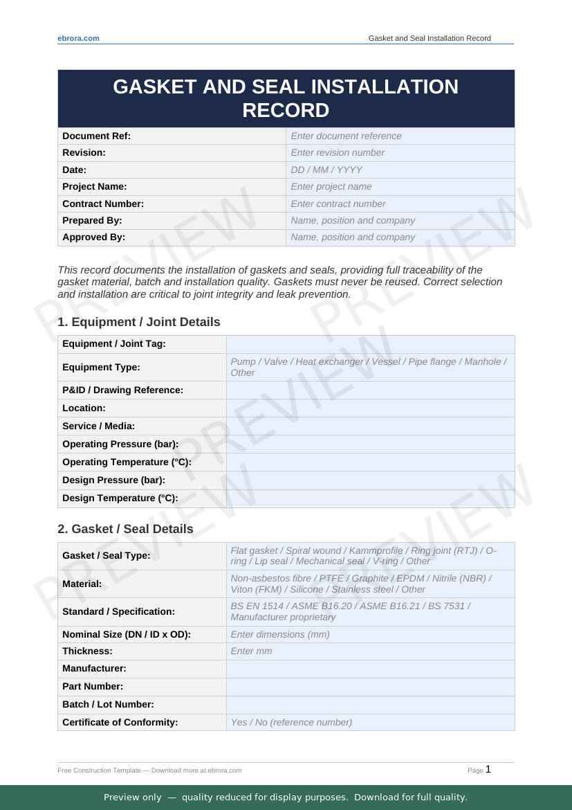 Free Word template: Gasket and Seal Installation Record. Download for UK construction sites.