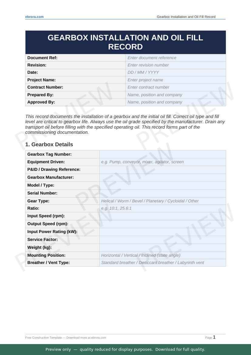 Free Word template: Gearbox Installation and Oil Fill Record. Download for UK construction sites.