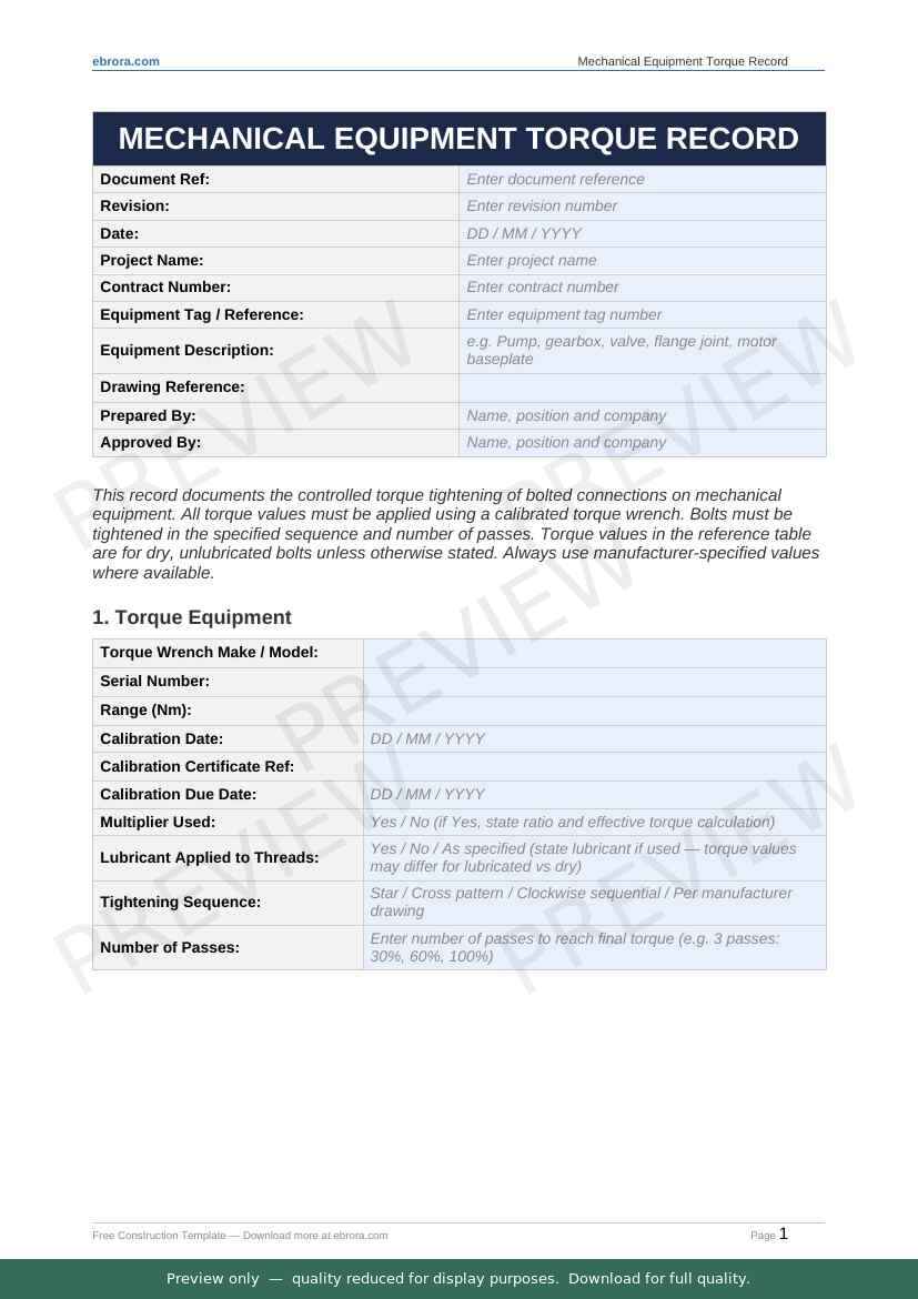 Free Word template: Mechanical Equipment Torque Record. Download for UK construction sites.